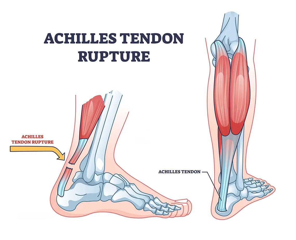 ACHILLES TENDON RUPTUREThe Achilles tendon must be both stiff and spring-like to generate force and facilitate efficient propulsion. It commonly tears higher up from its insertion on the calcaneus (heel bone). The typical mechanism of injury (MOI) involves the lower extremity moving into eccentric dorsiflexion, where the calf is lengthening under tension, followed by a rapid transition into concentric plantarflexion as the athlete attempts to push off. During this quick sequence, the combination of bodyweight and force production can exceed the tendon’s threshold for load, leading to a rupture. The characteristic 'pop' often reported with an ATR is the result of that excessive energy being released—according to the law of conservation of energy, the force that would have gone into the tendon is converted into sound.Following rupture, the tendon structure is compromised, shifting from strong type I collagen to weaker type III collagen. Without proper loading, the healing tendon may remain fragile. Smart, progressive loading is essential to restore tissue resilience and function.